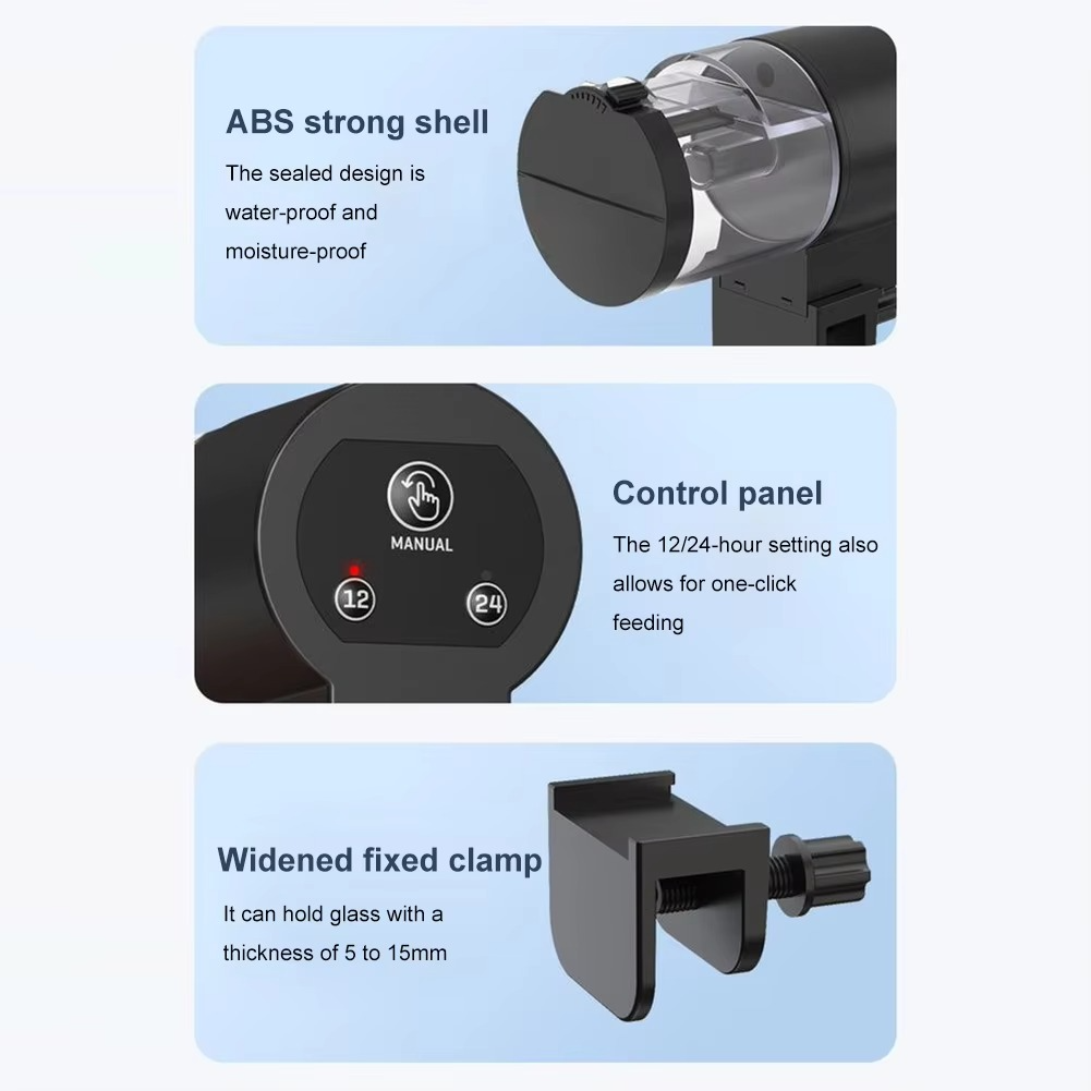 The Automatic Intelligent Control Fish Feeder is designed for small to large aquariums and turtle tanks. With a 100ml capacity and adjustable feeding options, it provides convenient, moisture-proof storage, ensuring precise feeding intervals and preventing overfeeding.